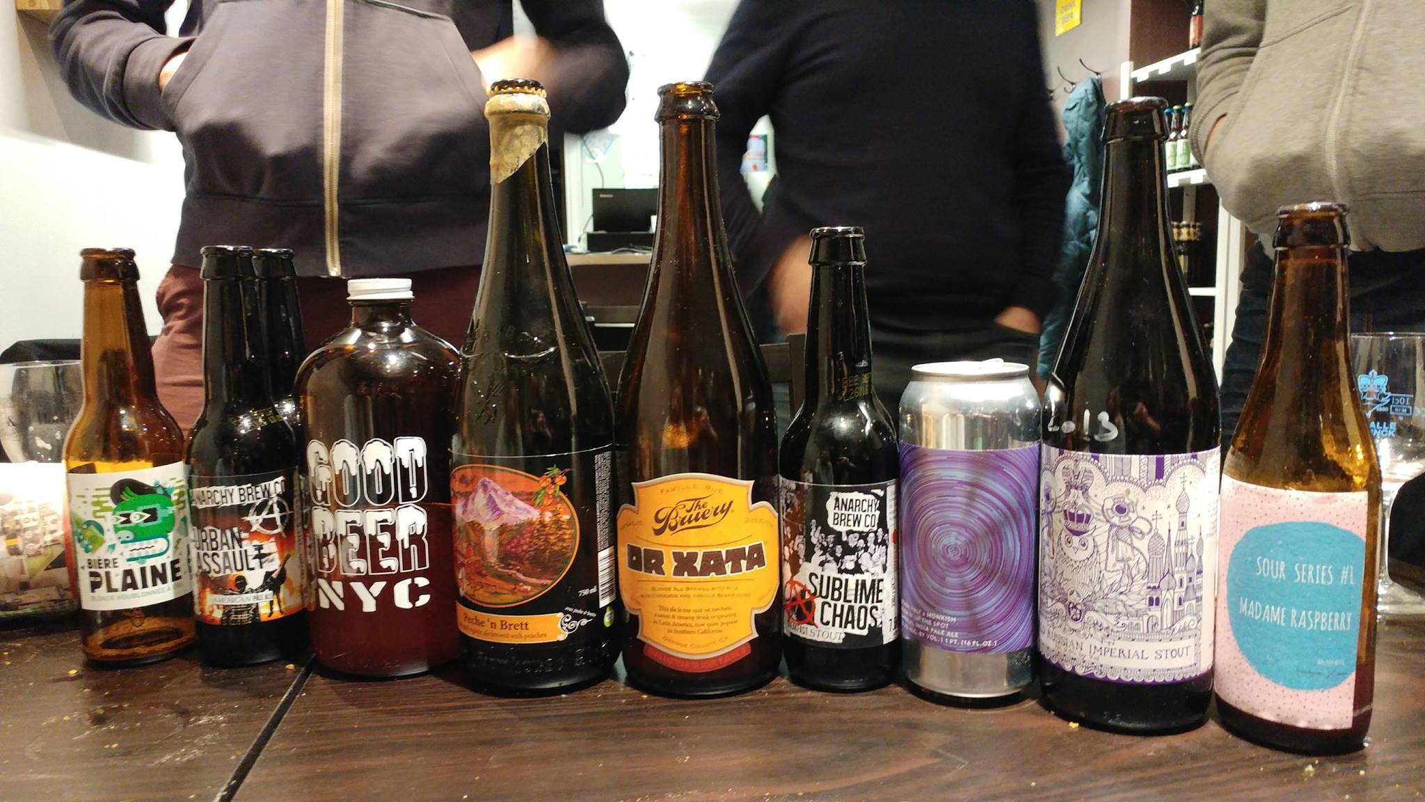 Logsdon - Peche ‘n Brett (Brett Farmhouse à la pêche, 10%, US) : Très gros nez de Brett. Bien que j’ai reconnu la brasserie à la bouteille, je pense sentir de l’abricot très léger au nez. Alexis note que le goût en bouche est intense, et pense à un haut taux d’alcool. La plupart est assez dérouté (en bien) face à cette grosse bière axée autour de la Brett et peine à la rattacher à d’autres bières de leur référentiel.
